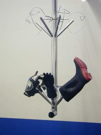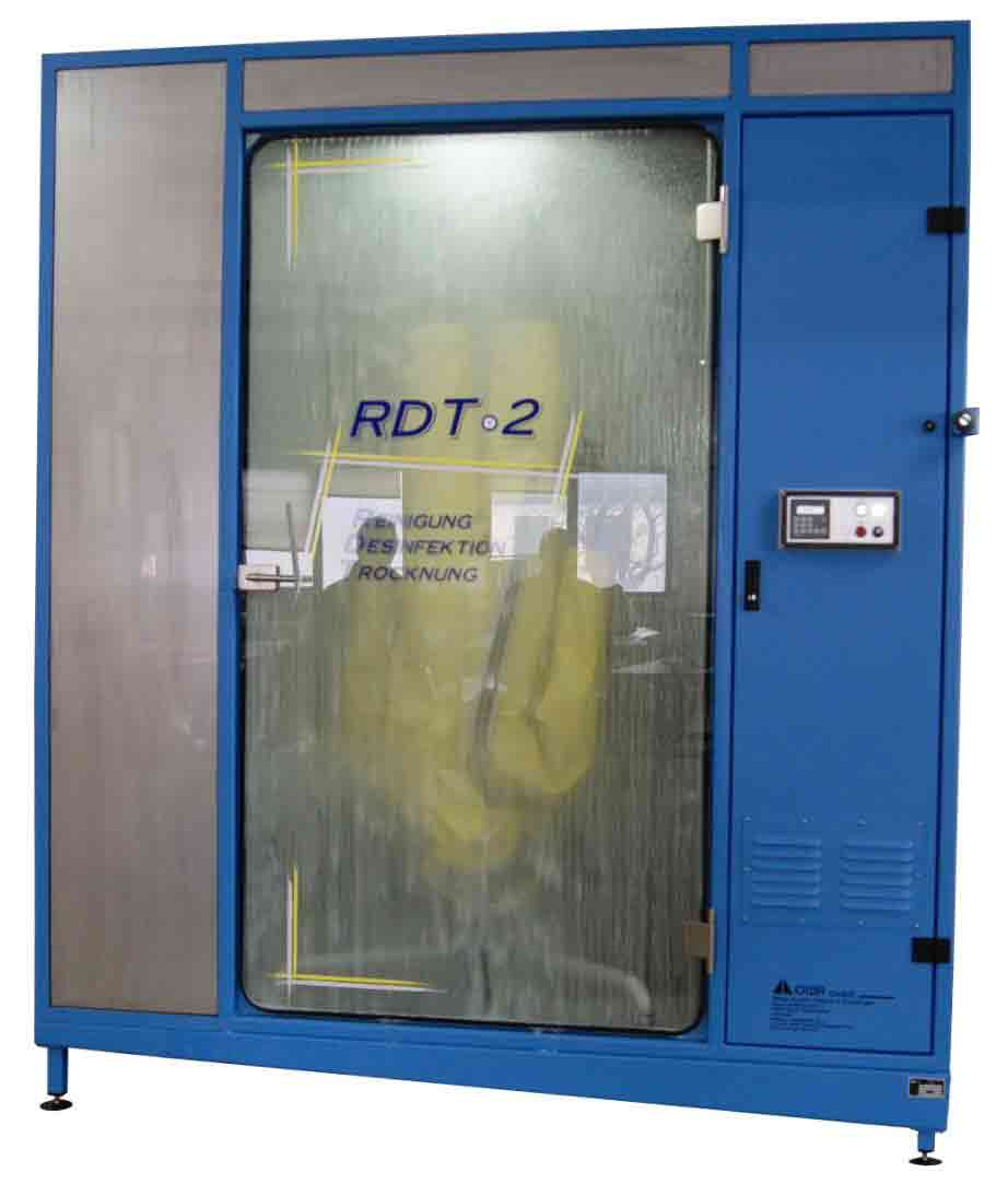 当应急人员从事故、灾难现场执勤完后,他们穿戴的防护服需要特别的清洁、杀菌、消毒。RDT就是完成此类工作的专业洗涤舱。除此之外,各类用于人员防护的装备,如防毒面具、专业靴子以及工具,都可以通过RDT得到有效的清洁、杀菌消毒、干燥。 通过SPS界面,可以控制各种不同的程序,最大程度的保证了各种清洗步骤设置的灵活性,满足各种清洗的要求。RDT洗涤舱可以按照不同的尺寸来生产加工,以确保一次可以清洗1到4套防护服。根据需要和应用的要求,最多可以加入三种不同的洗消剂、杀菌消毒剂。 在清洗过程中,衣物被倒挂于衣架上,借助喷嘴,实现对衣物内部的清洗。对于专业靴子、防毒面具同样采用特殊的支撑架,借助喷嘴,实现对衣物内部的清洗。对于专业靴子、防毒面具同样采用特殊的支撑架,以实现彻底无遗漏的清洗。对于工具和其他设备,可以按照用户的要求,采用特殊的支撑系统,以实现彻底无遗漏清洗。
